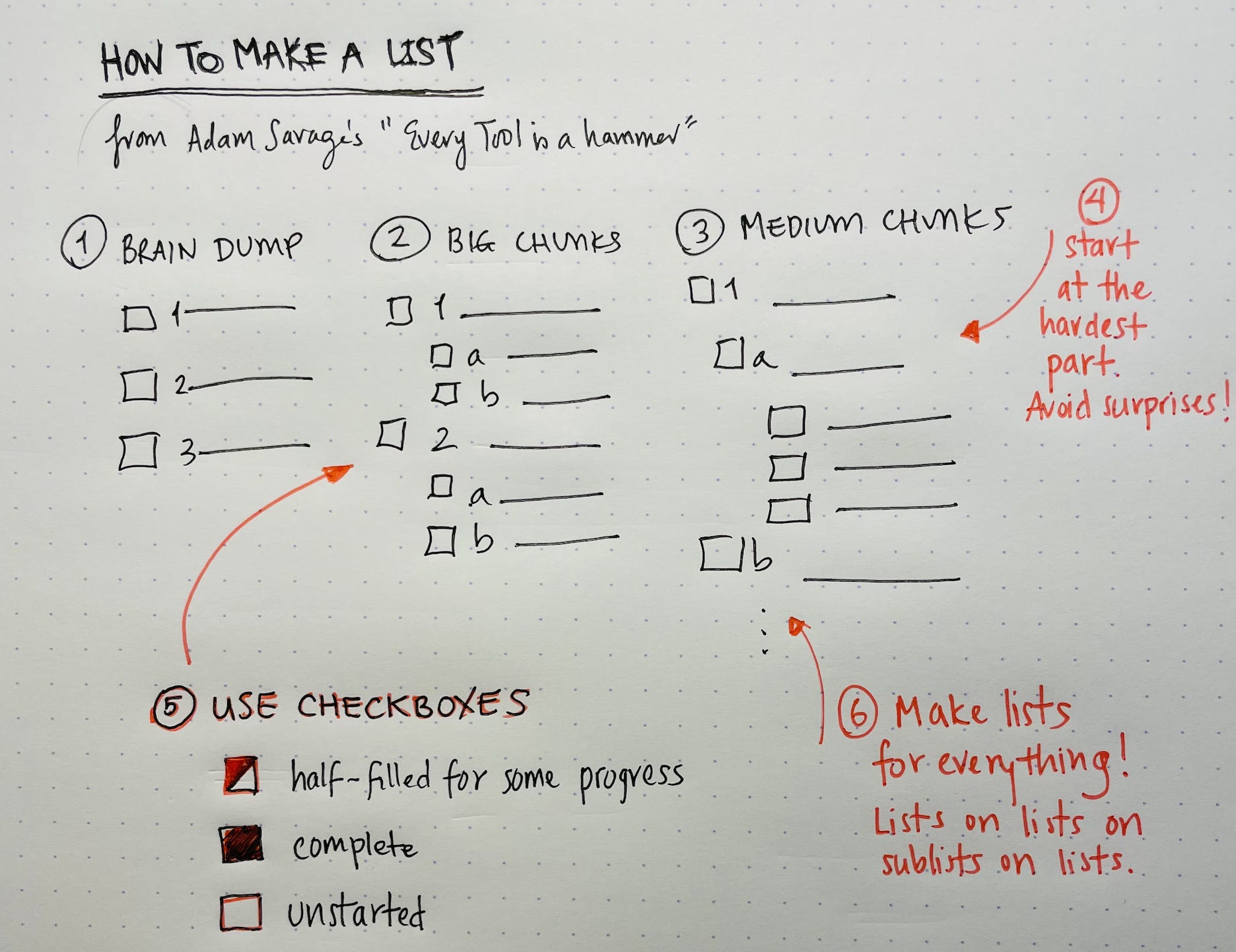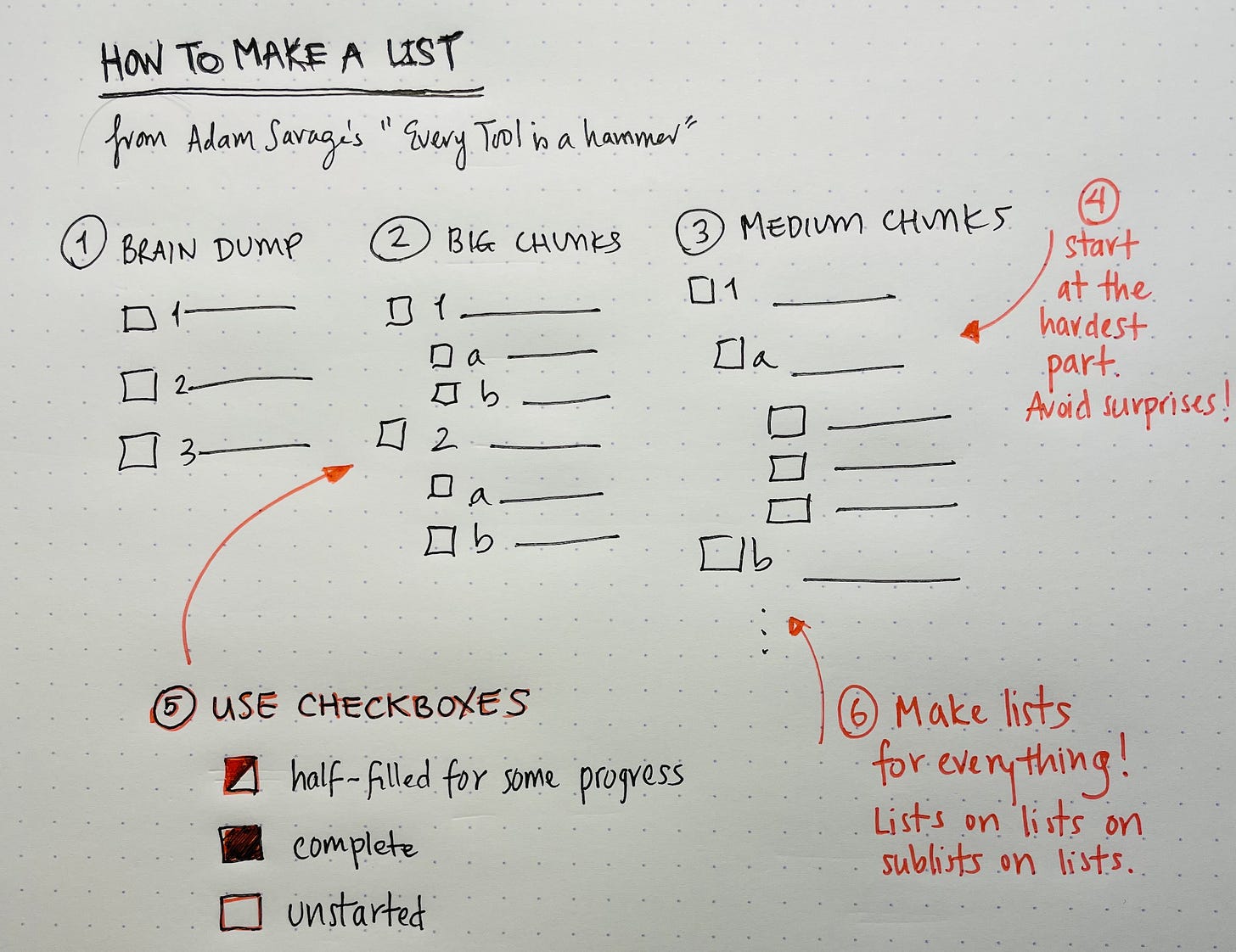 Of course, the power of checklists isn’t new. Lots of people have talked about lists with Atul Gawande’s “The Checklist Manifesto” being the most famous - checklists can be powerful in settings large and small from preventing plane accidents to surgical mishaps. However, I found Savage’s suggestions for how to make a list succinct and practical (whereas the Checklist Manifesto doesn’t really get into details of a practitioner).